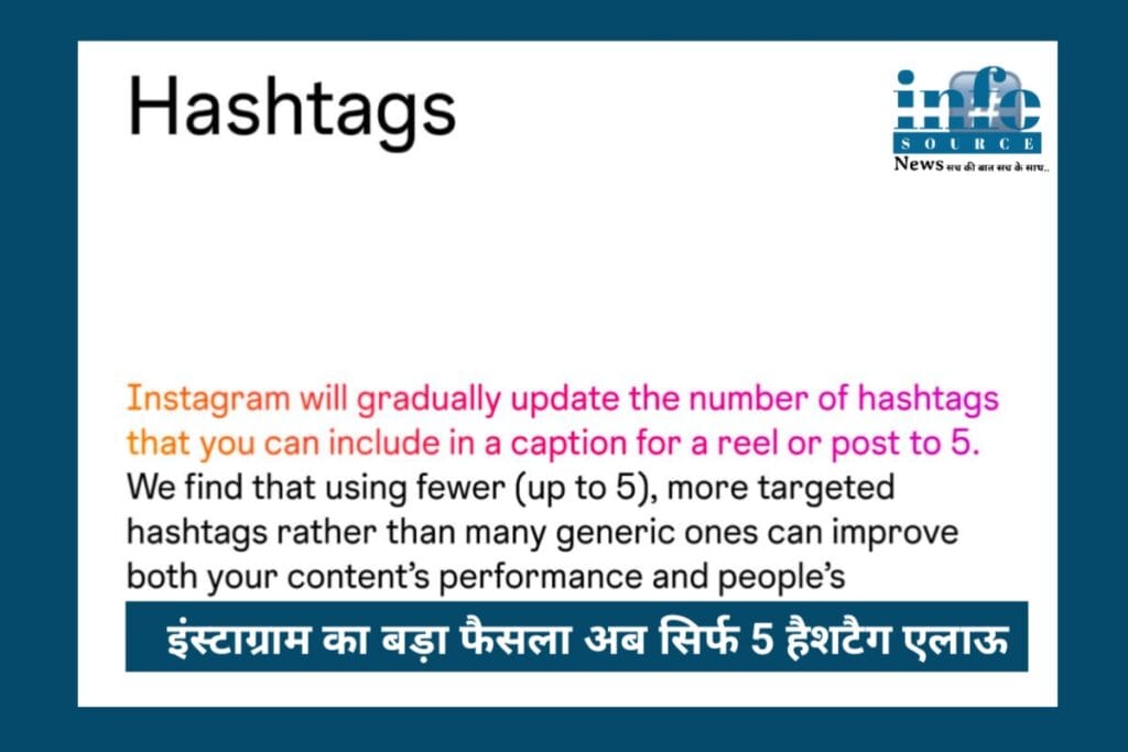 इसके तुरंत बाद Instagram ने अपनी पोस्टिंग पॉलिसी में बड़ा बदलाव कर दिया। अब कोई भी यूज़र चाहे वो क्रिएटर हो, बिज़नेस अकाउंट हो या आम इंसान एक पोस्ट या Reel में सिर्फ़ 5 हैशटैग ही इस्तेमाल कर सकता है। पहले जहाँ लोग 20–30 हैशटैग ठूंस-ठूंस कर डालते थे, अब वो दौर ख़त्म हो चुका है। ये नया नियम अब सब पर लागू हो गया है, इसमें कोई छूट नहीं है।
